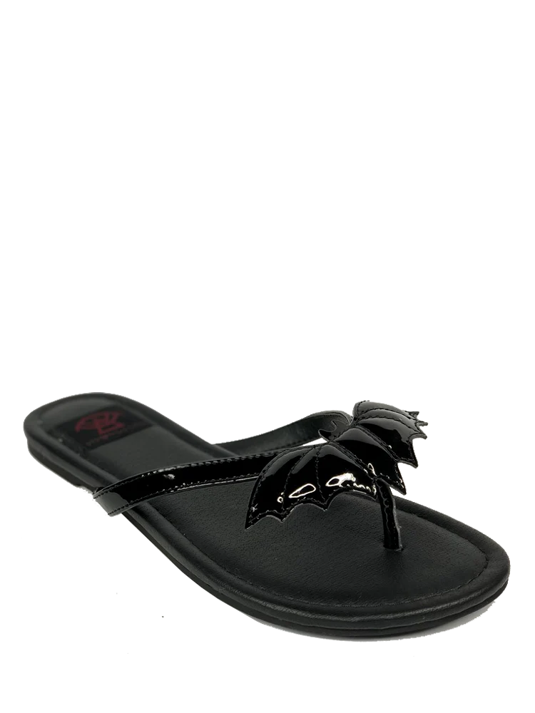 BAT! Introducing BETTY BAT, the perfect summer sandal with a sleek black vegan patent leather upper, luxurious black vegan leather lining, intricate black vegan patent leather BAT detail, and a durable black rubber outsole.