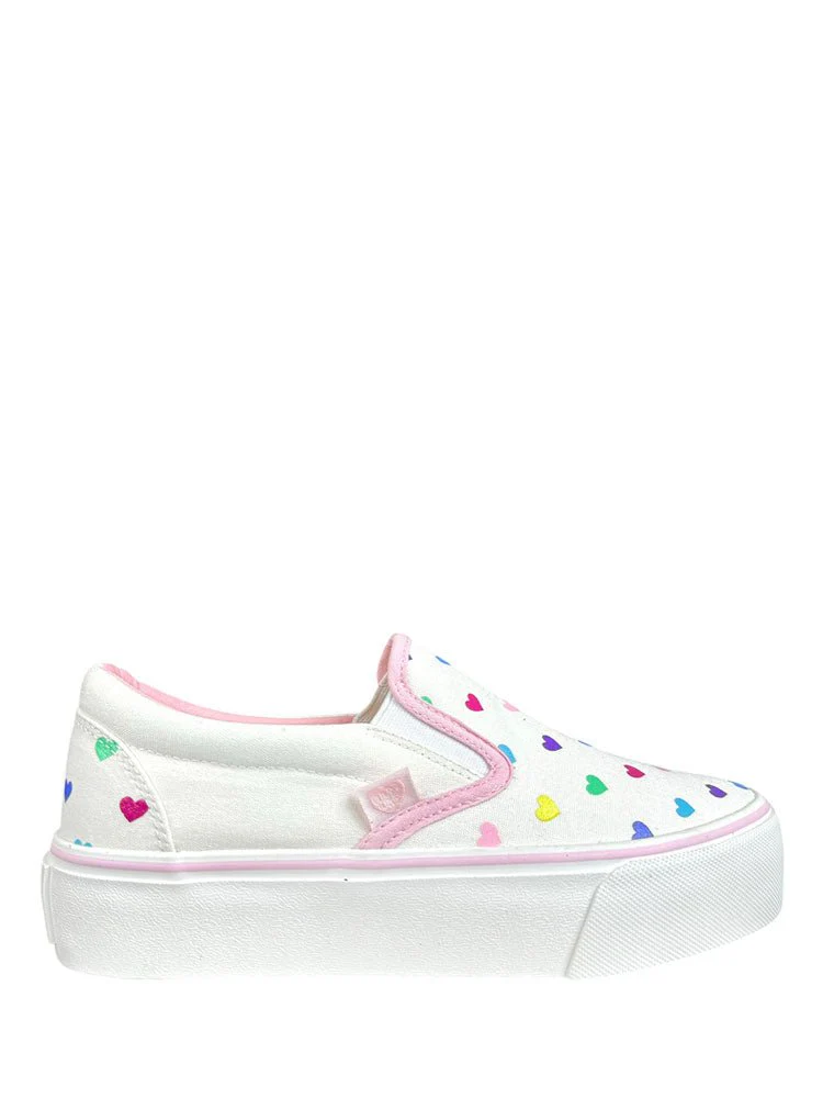 Elevate your style with CHILL HEARTS - WHITE/PASTEL. The chic white canvas upper adorned with pastel printed hearts offers a fun and unique touch, while the canvas lining and white rubber outsole provide comfort and durability. With a 1.5 inch platform, these shoes are perfect for any casual occasion.