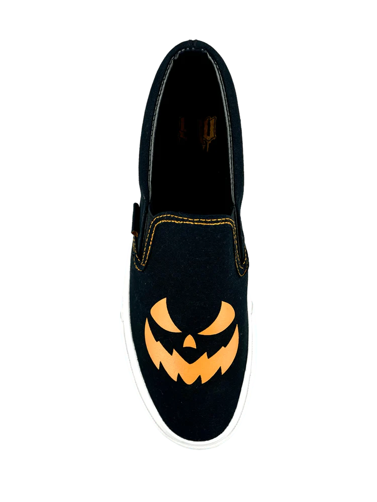 Halloween Jack slipons are here. The Chill sneaker fits slightly narrow. Consider sizing up for a more comfortable fit. This product features a black canvas upper with an orange Jackolantern face screen print and a white rubber outsole.