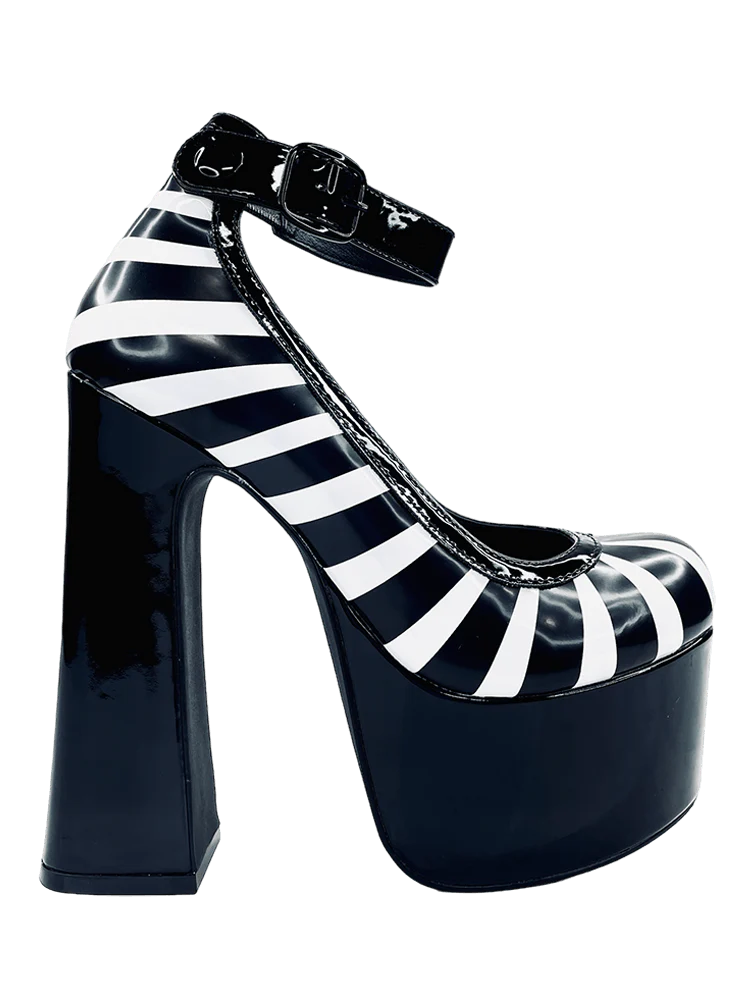 Monster High and YRU bring you Frankie's heel to life. Crafted with a sleek combination of black and white striped vegan patent leather, this FRIGHT - BLACK/WHITE product boasts a sophisticated aesthetic. The upper is adorned with black vegan leather binding and features a snap buckle ankle strap for added style. The bottom is made of black vegan patent leather and is finished with a durable black rubber outsole. With a 2-inch platform and a 6-inch heel, this product is both fashion-forward and comfortable.
