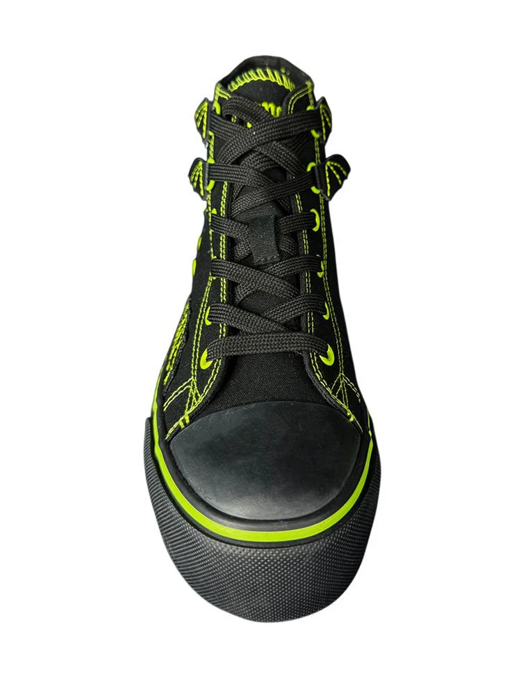Dare to be different with HXC - BLACK/GREEN. Featuring a black canvas upper and unique black vegan leather bat wing holder detail, these shoes will take you to new heights. With a sturdy black rubber toe and outsole, along with a 1.25 inch platform bottom, you'll make a statement while feeling comfortable and confident. (Flying not included!)