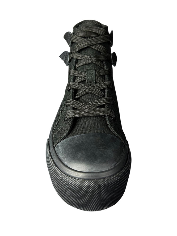 Dare to be different with HXC - BLACK. Featuring a black canvas upper and unique black vegan leather bat wing holder detail, these shoes will take you to new heights. With a sturdy black rubber toe and outsole, along with a 1.25 inch platform bottom, you'll make a statement while feeling comfortable and confident. (Flying not included!)