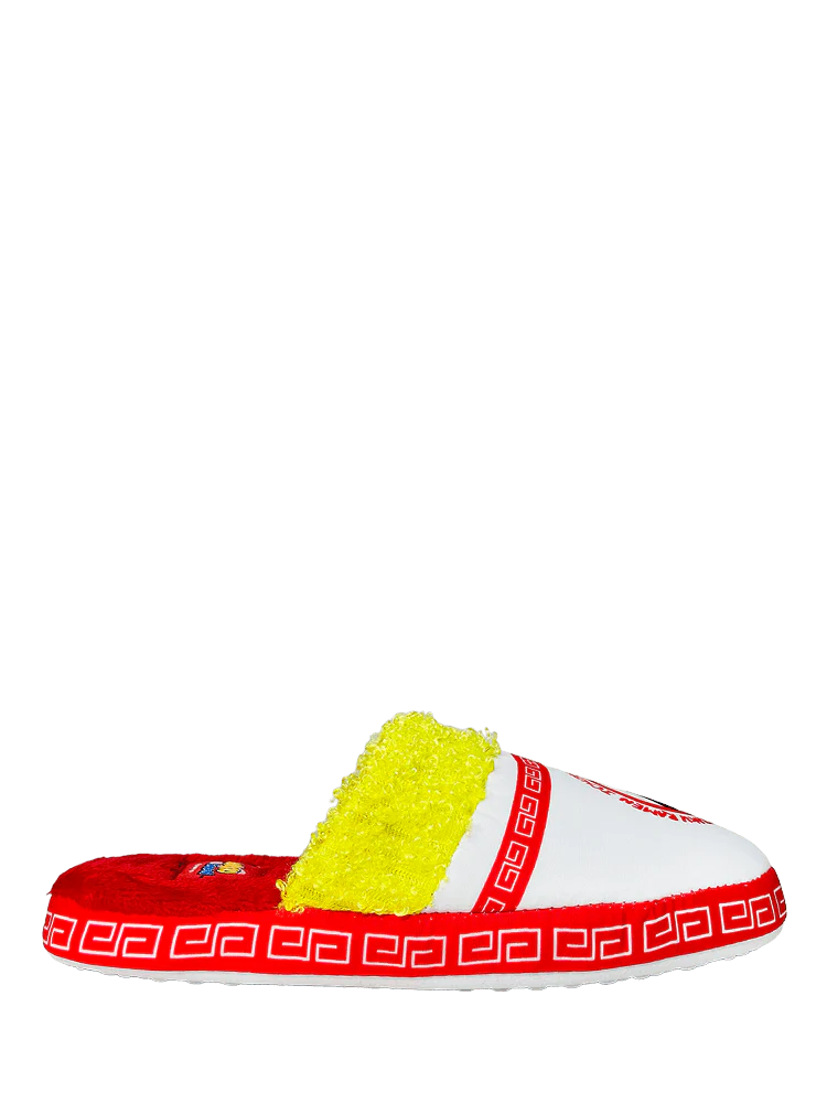 The ICHIRAKU RAMEN SLIPPER features a printed nylon upper with yellow curly faux fur detailing, complemented by a red furry lining, and finished off with a white rubber outsole.