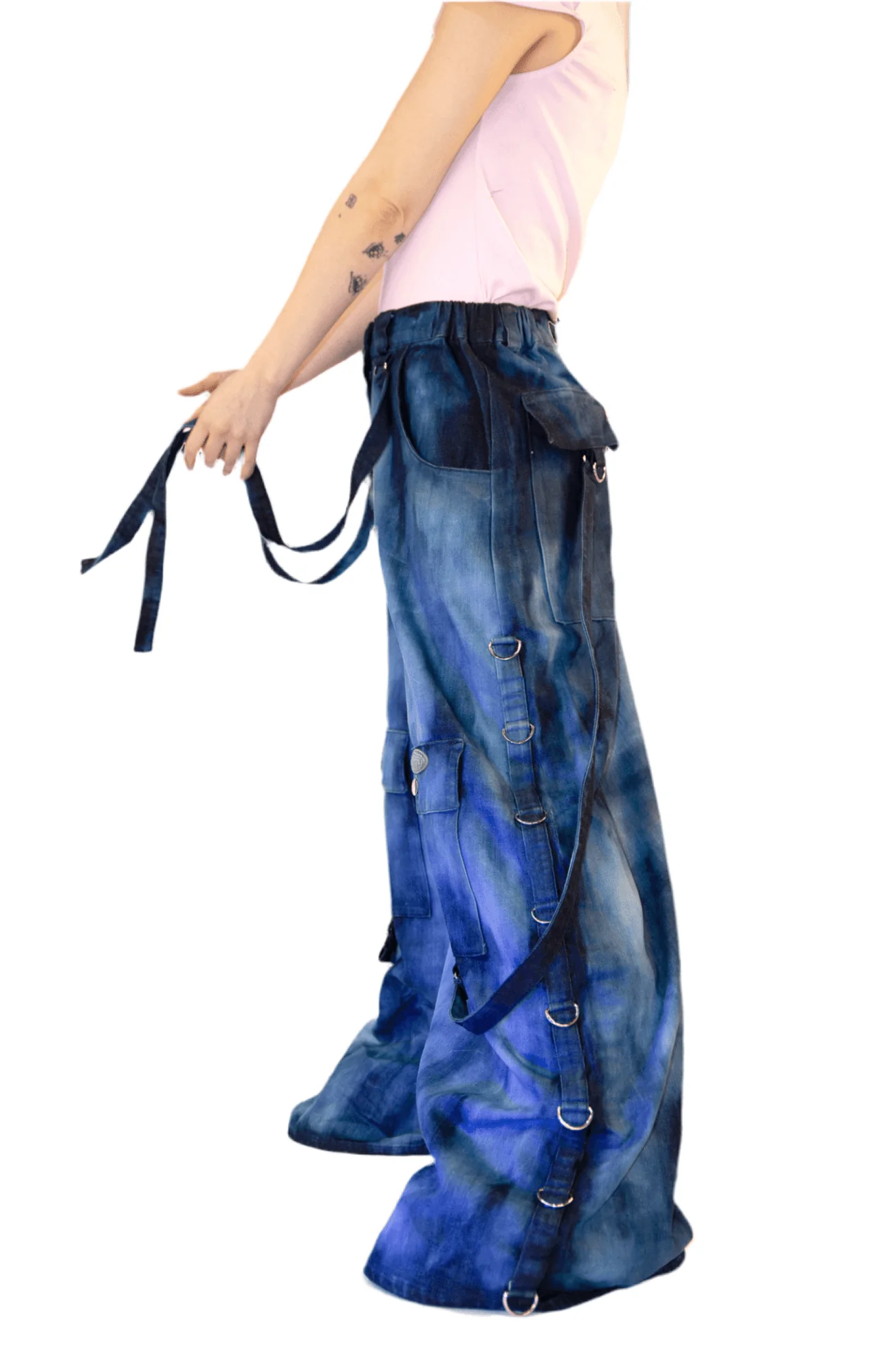 Triple wide leg vegan leather body. D ring pocket straps. Strap belts for leg adjustments. Deep utility front & hind pockets. Double elastic waist. Bottom hem adjustable bunjee chord locks. Adjustable leg length: 42'inches.