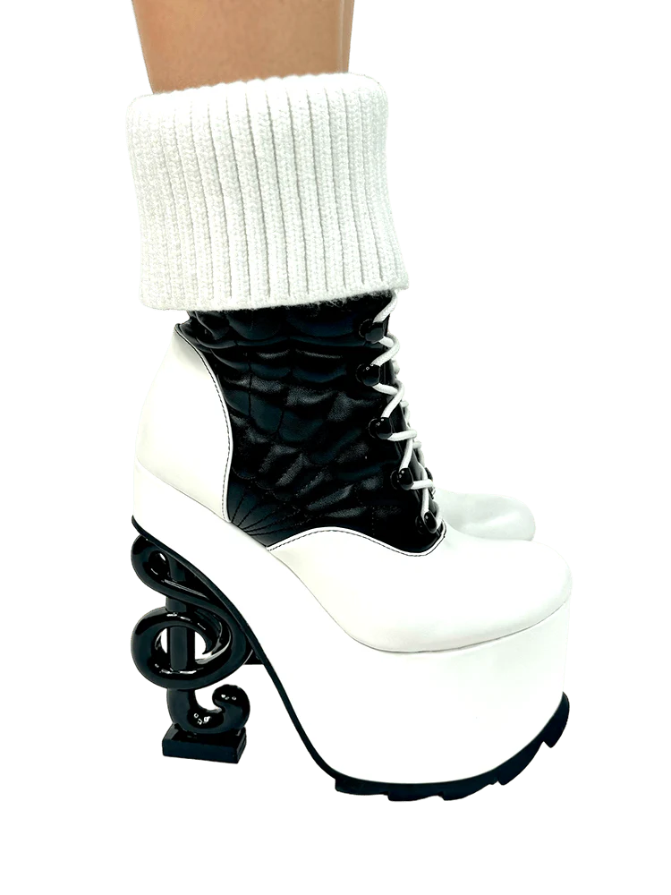 PHANTOM - BLACK/WHITE, featuring a vegan leather upper in black and white. With added instructions from the merchant, ensure a formal and informative tone using scientific and objective language, relying on statements of fact and domain expertise. Other details include a padded embroidered spider web stitch and knit faux sock, with an inner zipper for convenience. The bottom of the shoe is wrapped in white vegan leather, while the heel is molded into a music note design in black.