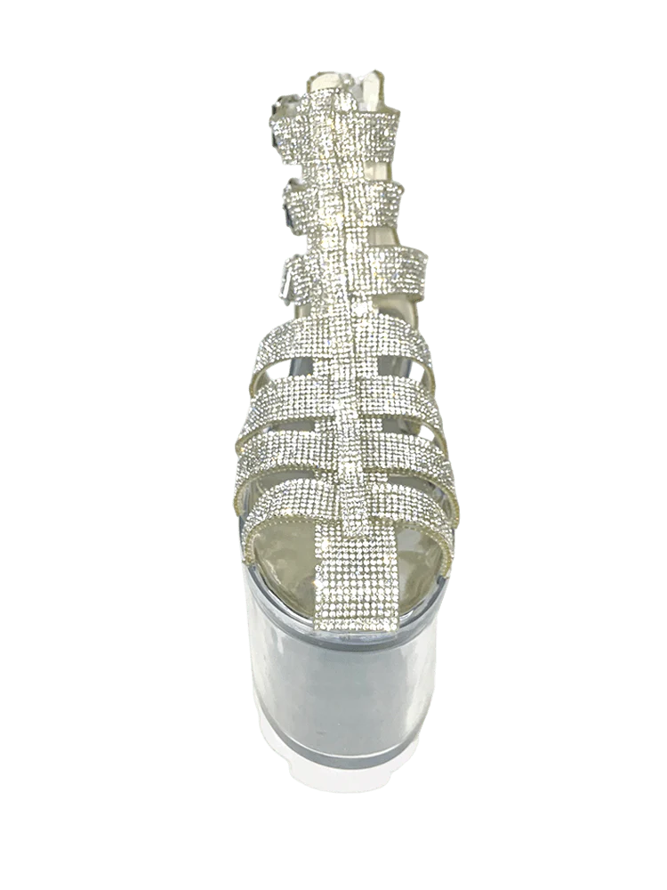 The QLOUD ODYSSEY - WHITE features a clear PVC upper embellished with rhinestones, silver chrome buckles and hardware, and a clear lucite bottom. The white rubber outsole provides a 3 inch platform, with a 4 inch bottom for added height.