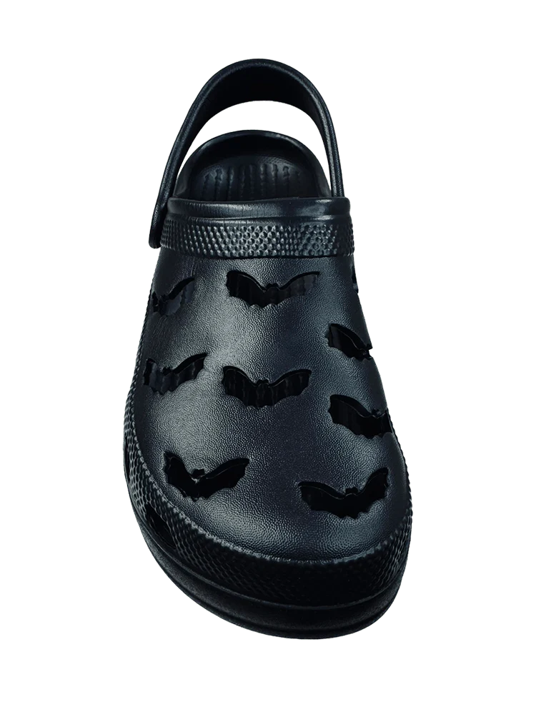 BAT! Celebrate your Goth/Halloween self in regular or sport mode. This black rubber clog features a bat cut out detail, with a 1.5 inch platform and 2 inch heel for added style and comfort.