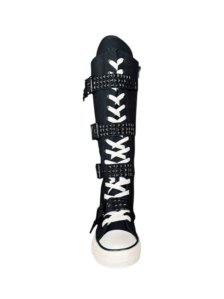 Unleash your inner chaos with the RAWR XD STUD—the ultimate emo anthem on a shoe. Black canvas upper meets adjustable straps adorned with edgy enamel pyramid studs that scream attitude. Lace up with classic white threading, slip through the convenient inner zipper, and stomp around on a crisp white rubber sole. Perfect for those who wear their darkness with a grin.