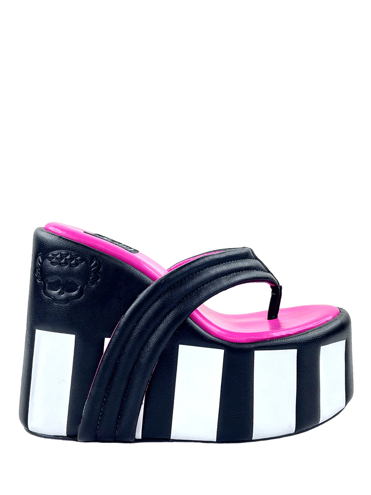 Monster High and YRU bring Lagoona's sandal to life. Crafted with expertise, these WAVE - BLACK/WHITE shoes feature black vegan leather padded straps, hot pink vegan leather lining, and a black and white wrapped vegan leather embossed EVA bottom. The Lagoona Skullette embossed detail and black rubber outsole offer a formal, stylish look, while the 3 inch platform and 6 inch heel provide a touch of height.